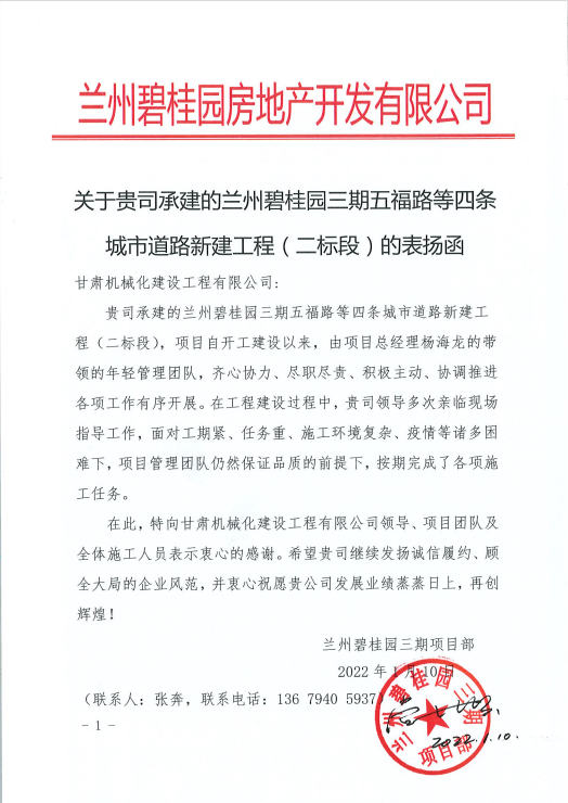 1月10日,我公司收到來自蘭州碧桂園房地產開發有限公司的表揚函,函中提到,蘭州碧桂園三期五福路等四條城市道路新建工程(二標段)項目自開工建設以來,項目人員面對工期緊、任務重、施工環境復雜、疫情等諸多困難,在保證品質的前提下,按期完成了各項施工任務,提出表揚。