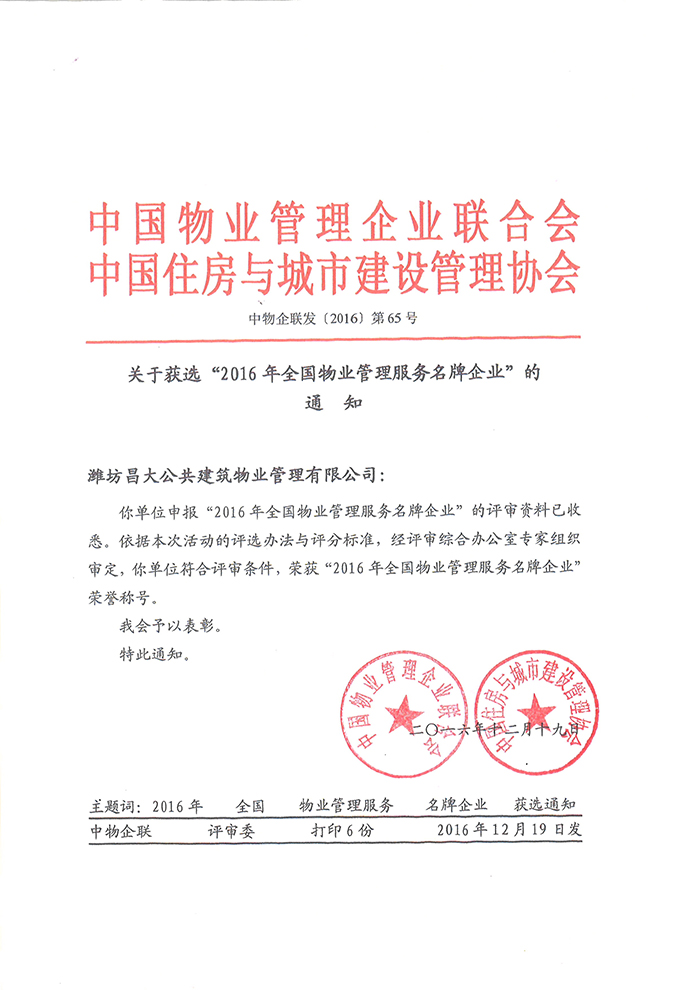 2016年度全國物業管理服務名牌企業